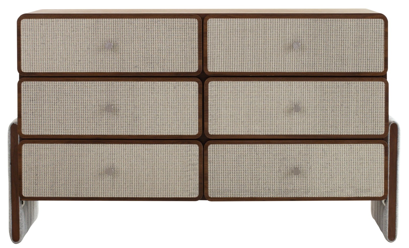 ارتقِ بمنزلك مع خزانة الأدراج ذات الـ 6 أدراج من أثاث فهمي، والتي تتميّز بواجهات أدراج مغطّاة بقماش ذي نسيج ملموس وزوايا مستديرة ناعمة. صُممت لتوفير تخزين أنيق وعملي، حيث تمنحك أدراجاً واسعة مثالية للملابس والإكسسوارات أو المستلزمات المنزلية. يضيف تشطيب الخشب العصري مع الألواح الجانبية المُنجّدة دفئاً وأناقة لأي غرفة نوم أو مساحة معيشة.
