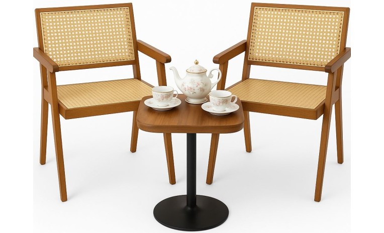 يتميز بإطار خشبي دافئ وتصميم كلاسيكي من الخيزران المنسوج على المقعد والظهر، مما يمنحه مظهراً خالداً مع توفير الراحة والدعم في آن واحد.