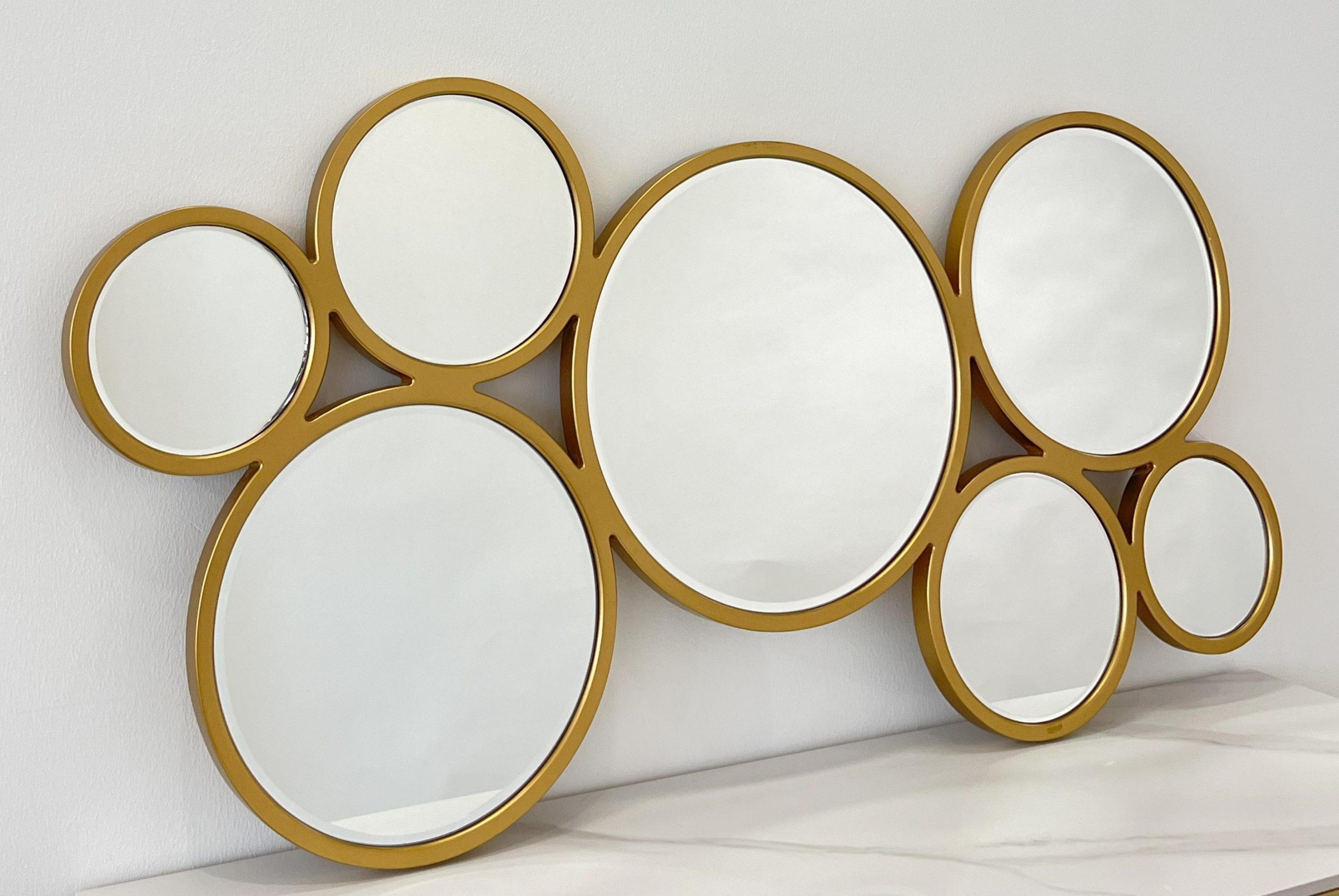 أضف لمسة من الذوق المعاصر إلى جدرانك مع مرآة الحائط الفريدة والملفتة للنظر. يتميز بمجموعة من الدوائر المتداخلة بلمسة نهائية ذهبية دافئة ، مما يخلق نقطة محورية مذهلة في أي غرفة.