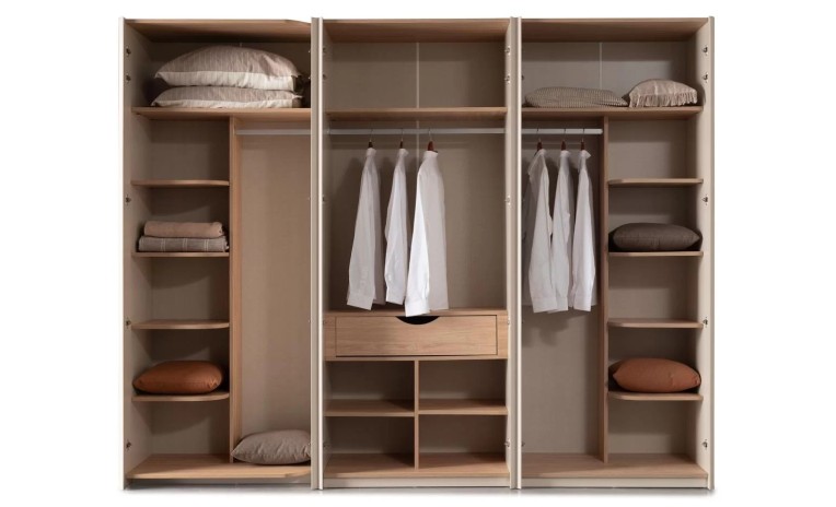 • الخزانة الوسطى (بمرايا): بابان مزودان بمرايا يفتحان على رف علوي واسع، مساحة تعليق، درج واحد، وأربعة رفوف إضافية لتنظيم عملي.