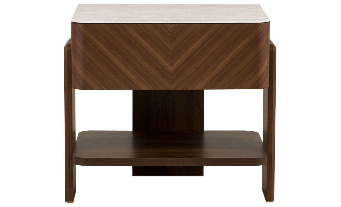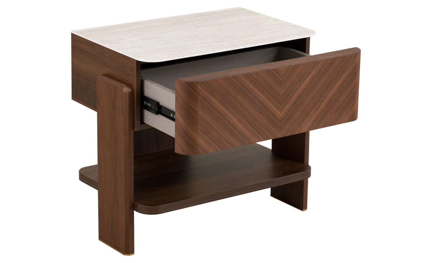 تتميّز هذه الطاولة الجانبية العصرية وعالية العملية من أثاث فهمي بتصميم فريد يجمع بين سطح يشبه حجر الترافرتين الصناعي وإطار بتشطيب فاخر من قشرة خشب الجوز. يضمّ الدرج الواسع واجهة بنمط عصري من عروق الخشب على شكل شيفرون، ويكشف عند فتحه عن مساحة تخزين مخفية كبيرة. كما يوفّر الرف السفلي مساحة إضافية للكتب أو القطع الديكورية، مما يجعلها خياراً مثالياً لغرف النوم الحديثة.