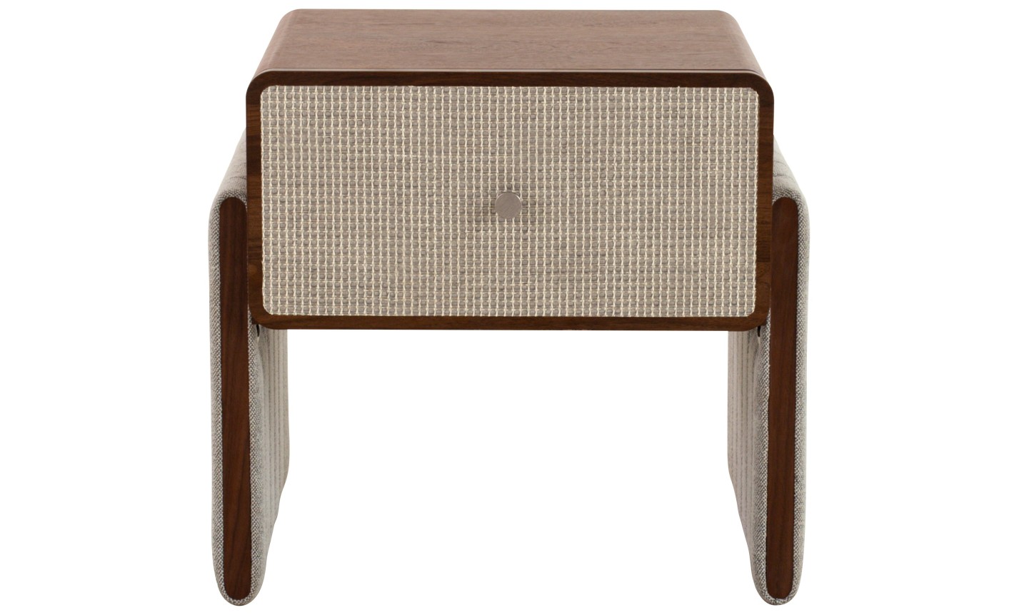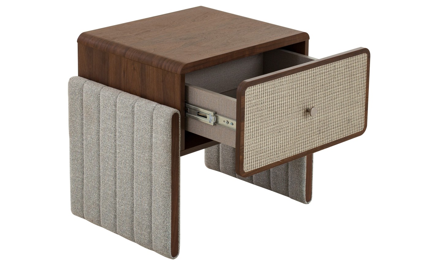 تجمع هذه الطاولة الجانبية بتصميم منتصف القرن من أثاث فهمي بين الخامات بطريقة أنيقة تمنحها مظهراً فريداً. يأتي الهيكل بتشطيب من قشرة الجوز الداكن الدافئ مع حواف مستديرة بلطف. وتتميّز بدرج كبير قابل للسحب مزوّد بإدراج عصري من خوص الروطان. كما تُغطّى الجوانب بتنجيد عمودي متموّج، مما يوفّر تبايناً ناعماً وراقياً مع خامات الخشب والروطان.