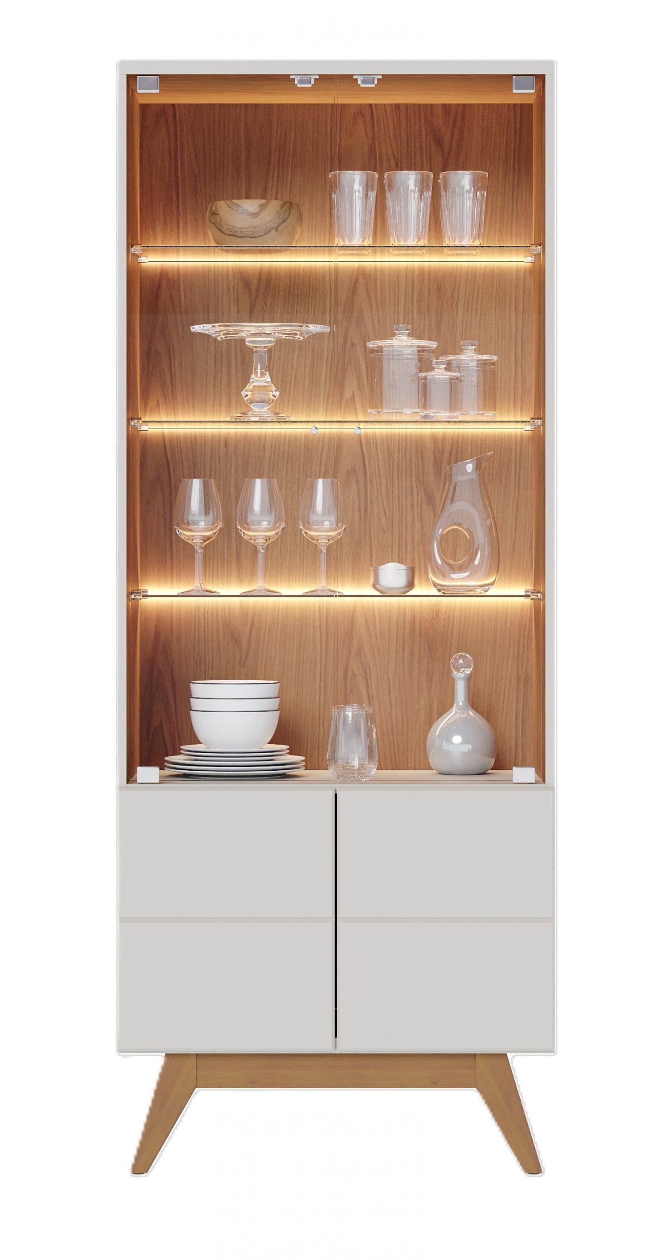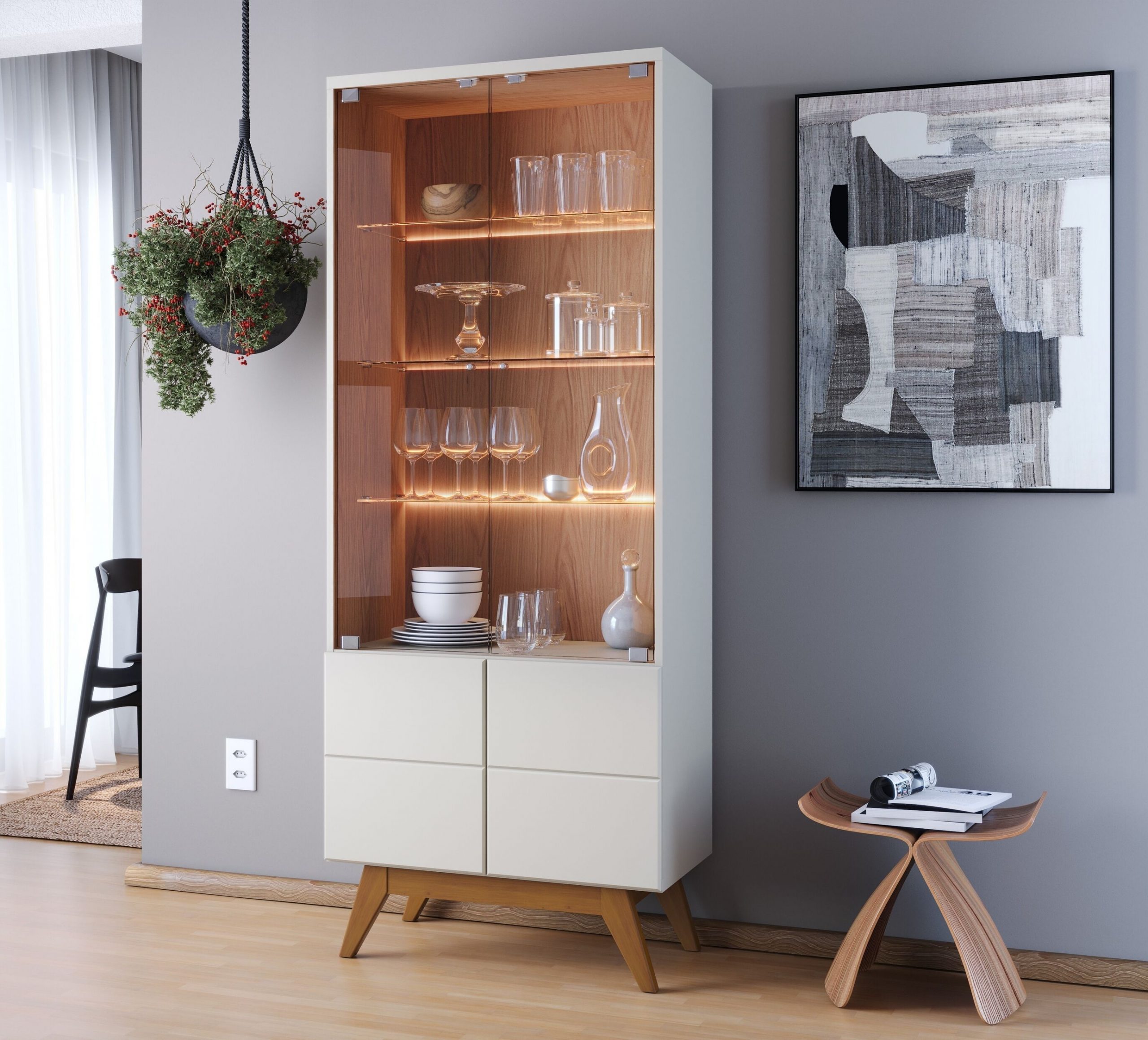 اعرض مقتنياتك الثمينة وخزّن الأساسيات بأناقة مع خزانة عرض نورونيا. تتميز هذه الخزانة بأبواب زجاجية علوية مزودة بإضاءة LED مدمجة، بالإضافة إلى درجين سفليين. يجمع تصميمها الأنيق بين لوحات غير لامعة بلون أوف وايت وإطار ولمسات بلون خشب فريجو الدافئ. قطعة عصرية وعملية مثالية لغرف المعيشة أو الطعام أو مداخل المنزل.