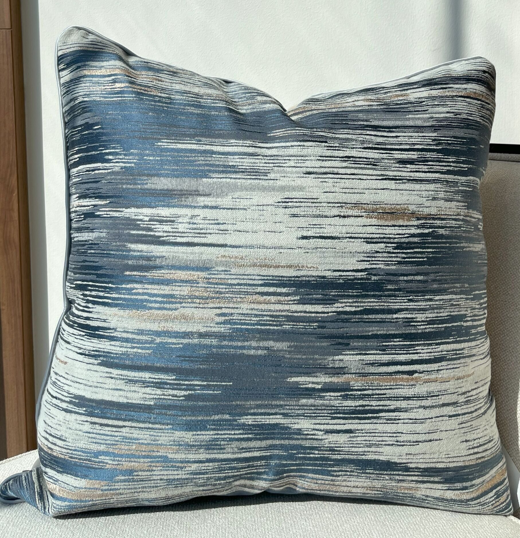 أضف لمسة من الأناقة إلى مساحة المعيشة الخاصة بك مع غطاء الوسادة الأنيق هذا. يتميز بتصميم محكم فاخر بظلال من الأزرق والذهبي ، ومن المؤكد أنه سيرفع مستوى أي أريكة أو كرسي بذراعين.