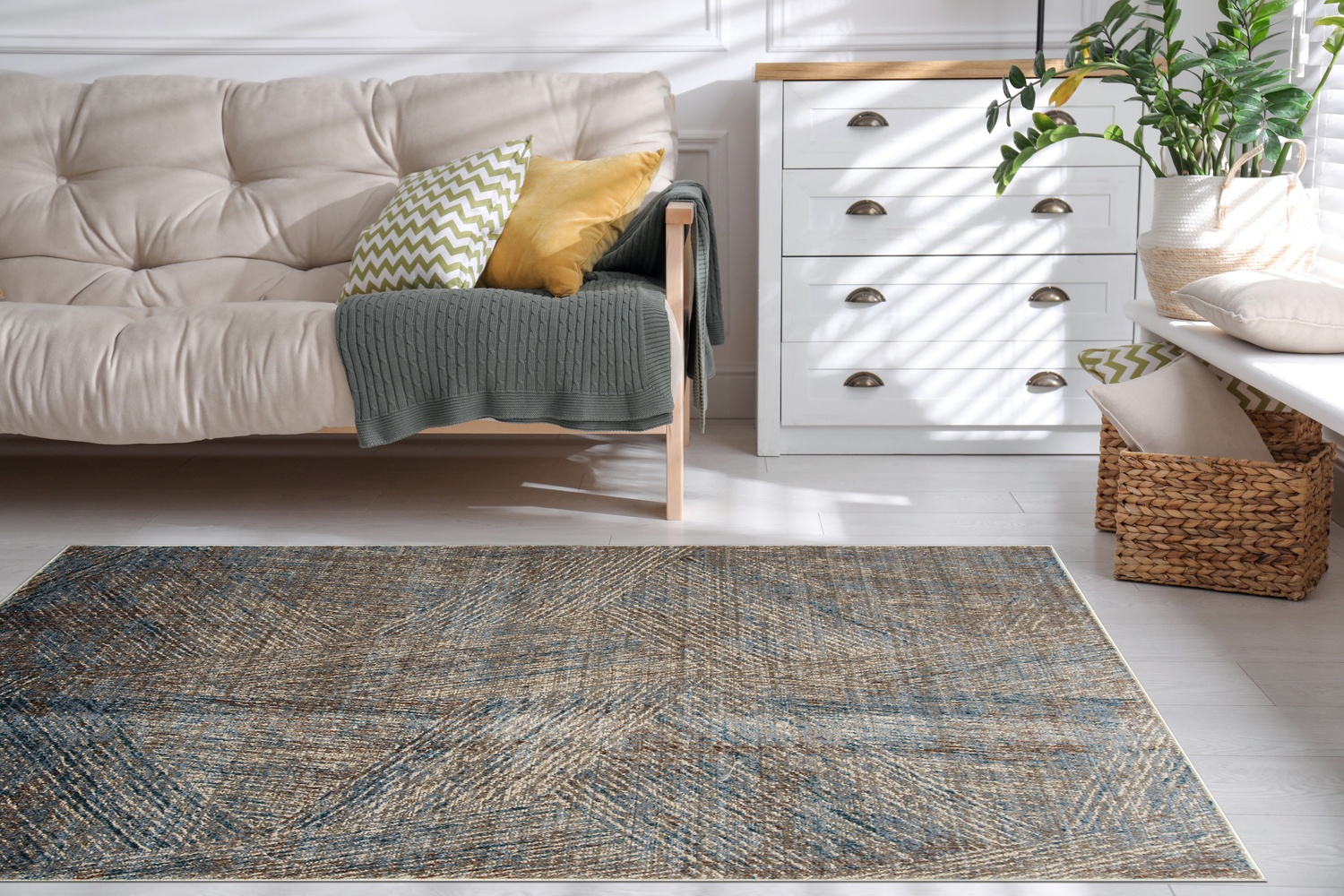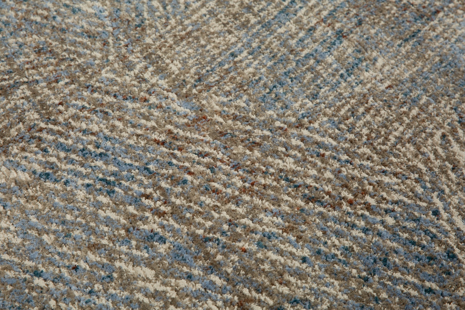 Energize your space with the Mojave Carpet Rug. This 160x220 cm rug features a dynamic brushstroke-style pattern in modern grey and blue tones with hints of brown. Its textured appearance and abstract design create a contemporary focal point, adding artistic flair and comfort to any room. Durable and stylish for modern interiors.