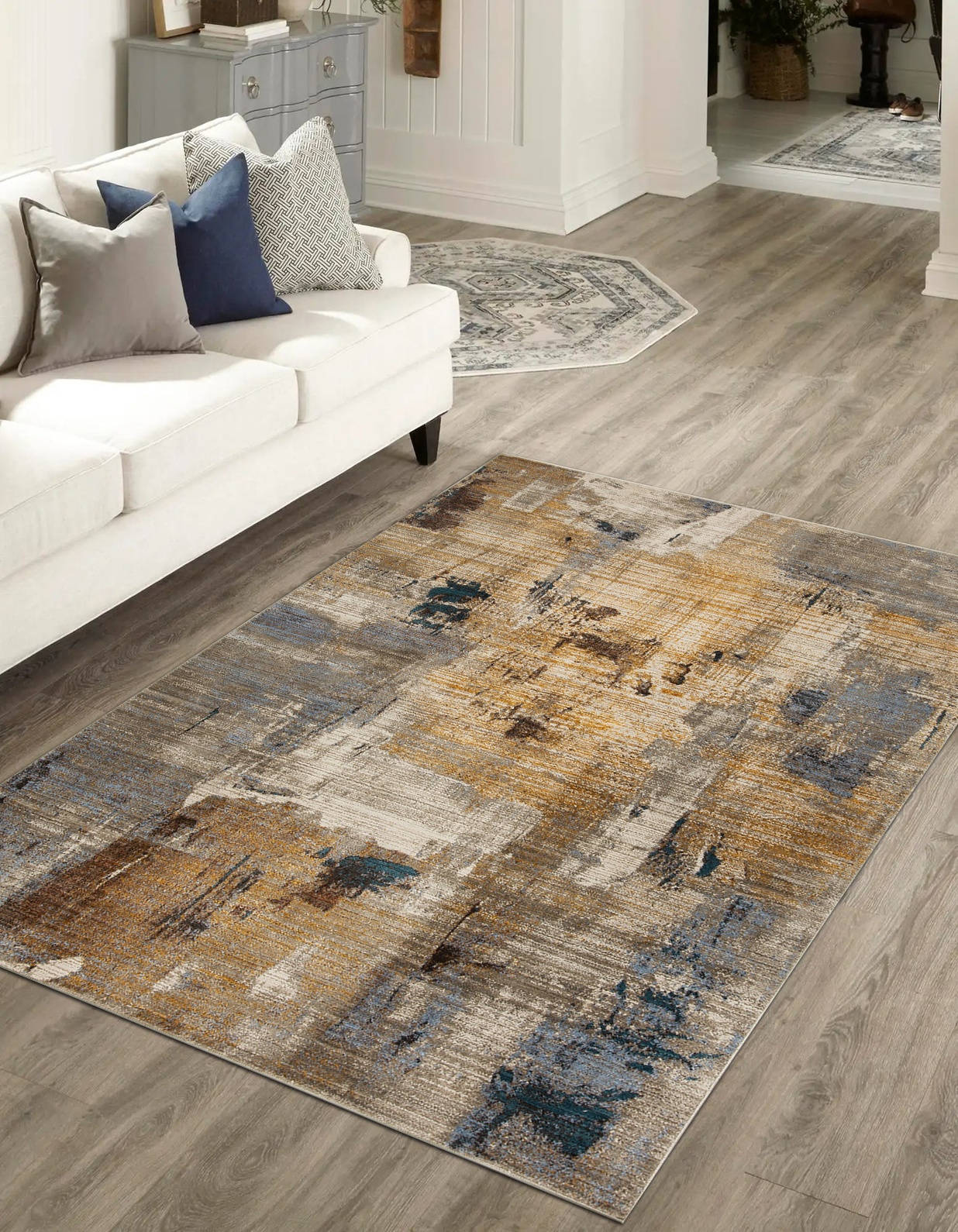 Introduce an artistic focal point with the Mojave Carpet Rug. Measuring 230×310 cm, this contemporary rug features a unique distressed pattern blending rich gold, grey, cream, and blue tones. Its textured finish adds depth and character, perfect for enhancing modern living spaces. Durable and stylish, it offers both beauty and comfort underfoot.