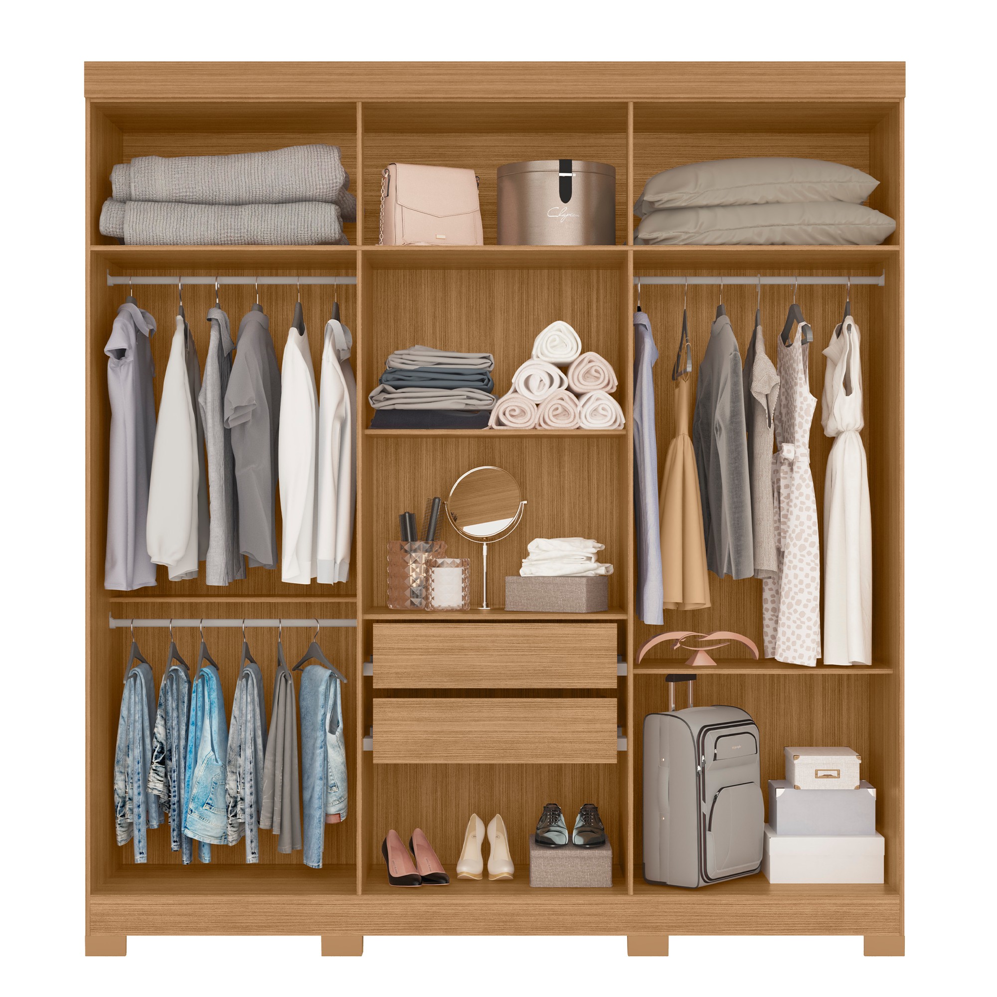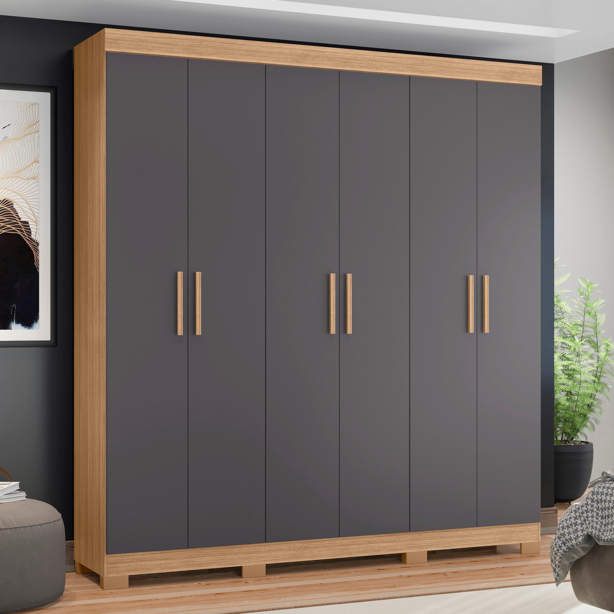 Discover extensive and organized storage with the Amarok Wardrobe. Featuring a warm Nature wood tone finish, this large wardrobe includes six doors and two spacious lower drawers. Inside, find ample shelving and hanging space to keep your clothing and accessories tidy. Its clean lines and modern design offer a stylish and functional solution for any bedroom.