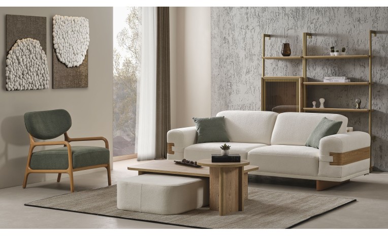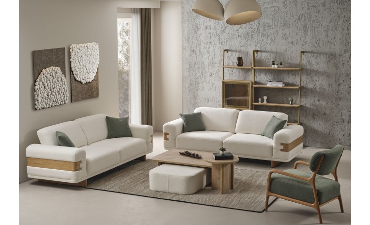 Elevate your living space with the Anka Living Room Set, a perfect blend of modern style and comfort. This elegant collection features two spacious sofas upholstered in a serene beige fabric with distinctive horizontal wood panels on the arms. The set is completed by a stylish green accent chair with a coordinating wood frame, offering a cohesive and inviting aesthetic for your living room.