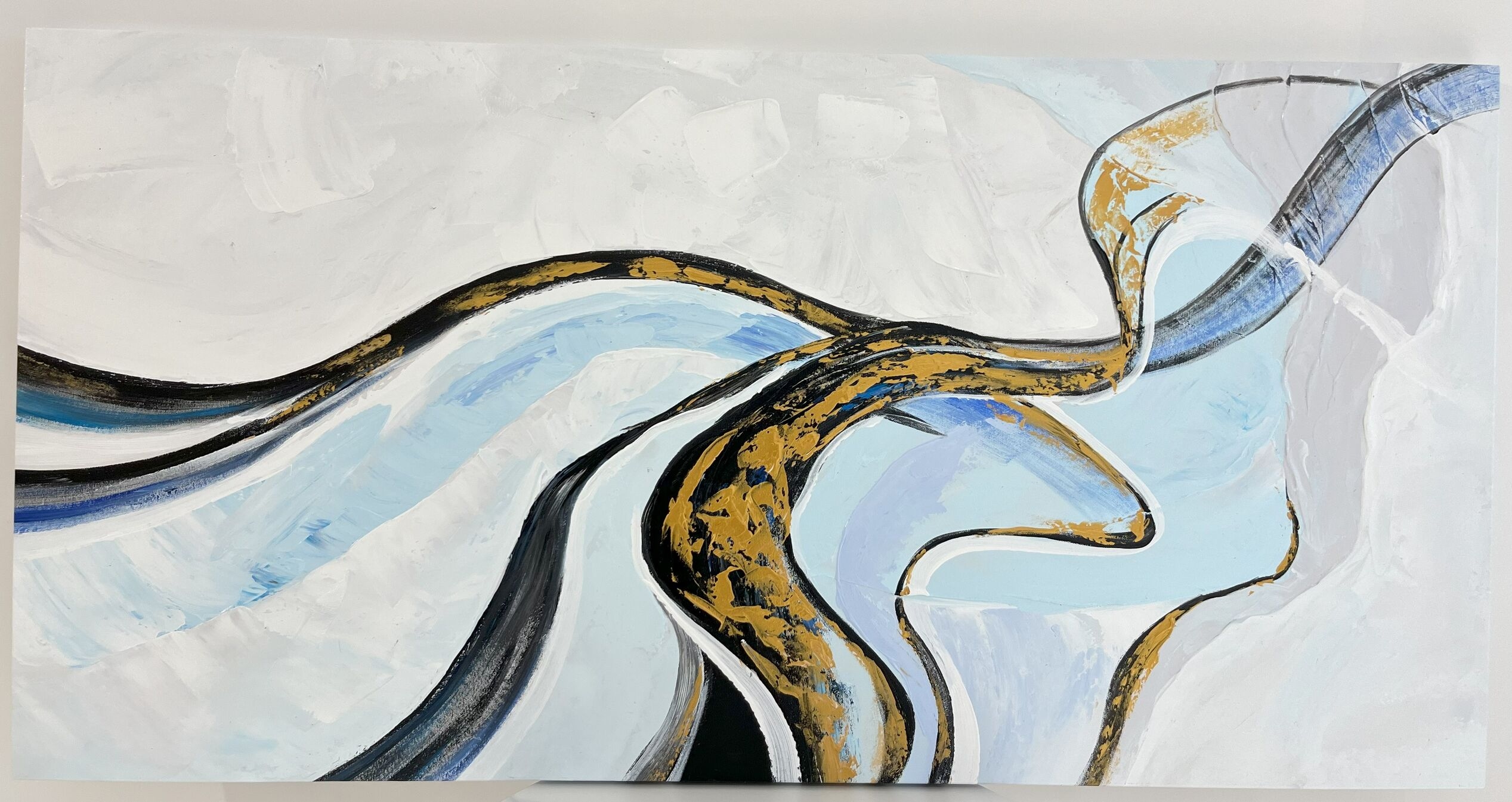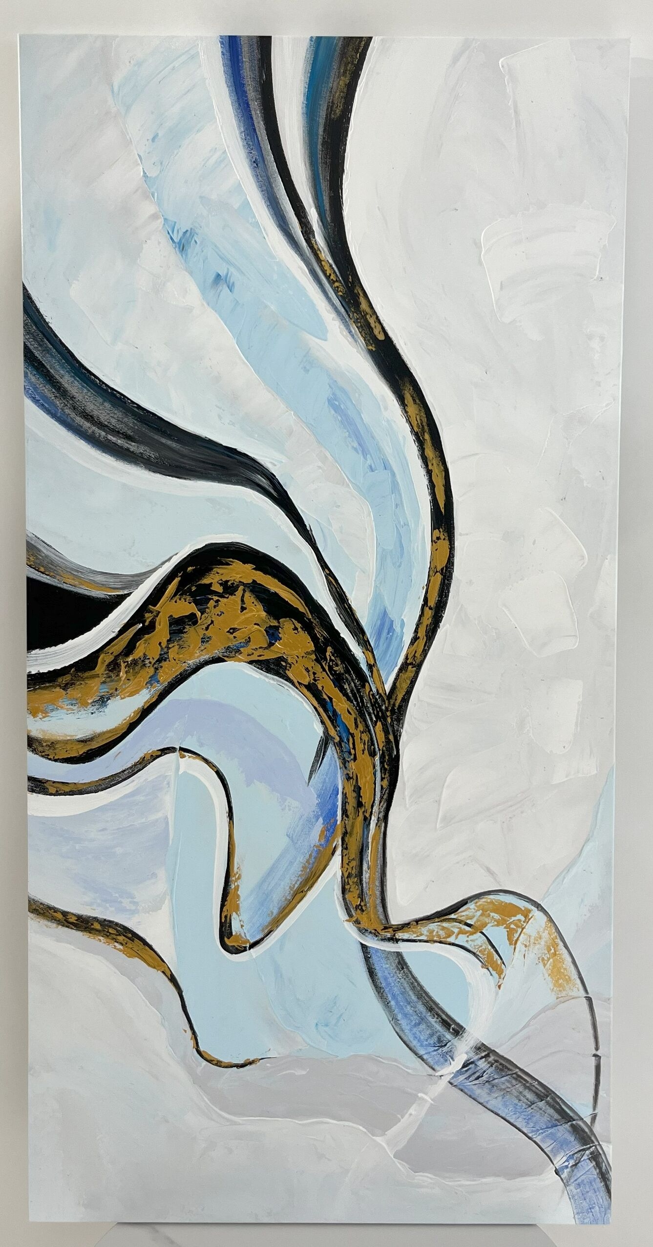 Add a touch of elegance to your space with this handmade abstract canvas painting. Featuring flowing blue and gold accents on a textured white background, this 60x120cm artwork brings a modern, dynamic aesthetic to any interior. Perfect for living rooms, offices, or art galleries.