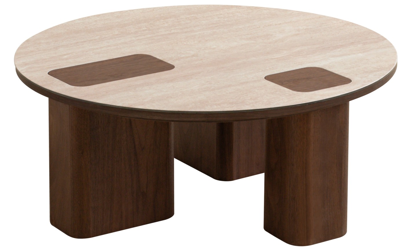 A contemporary statement piece, this round coffee table by Fahmy Furniture features a wide top with a beautiful light travertine finish. The surface is accented with two contrasting dark wood inlays for practical storage and visual interest. Supported by three thick, sculptural walnut block legs.