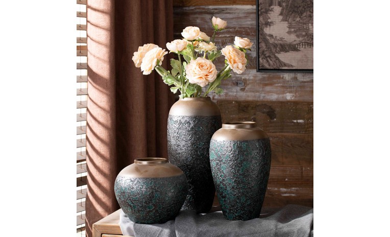 Elevate your decor with this stunning two-tone porcelain vase. Its unique design features a smooth, metallic upper section that beautifully contrasts with a deeply textured, rustic lower body. This sculptural piece adds a sophisticated, artistic touch to any living space or office. Perfect for displaying on a shelf or as a standalone centerpiece.