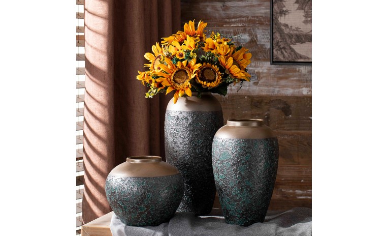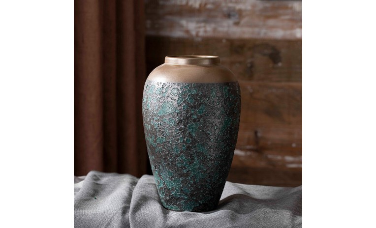 Elevate your decor with this stunning two-tone porcelain vase. Its unique design features a smooth, metallic upper section that beautifully contrasts with a deeply textured, rustic lower body. This sculptural piece adds a sophisticated, artistic touch to any living space or office. Perfect for displaying on a shelf or as a standalone centerpiece.