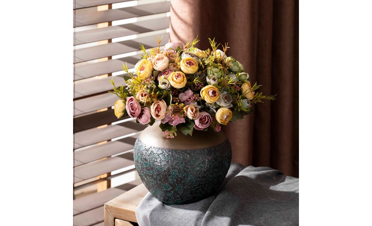 Elevate your decor with this stunning two-tone porcelain vase. Its unique design features a smooth, metallic upper section that beautifully contrasts with a deeply textured, rustic lower body. This sculptural piece adds a sophisticated, artistic touch to any living space or office. Perfect for displaying on a shelf or as a standalone centerpiece.