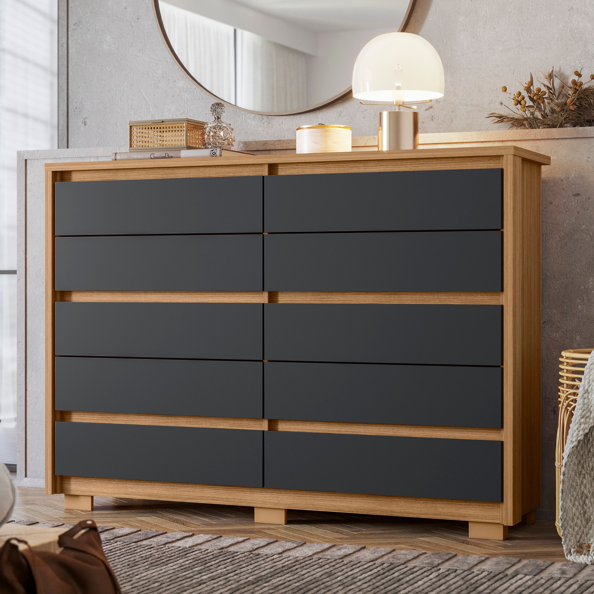 Organize your space with the Duetto 10 Drawer Dresser. This modern chest features a stylish two-tone design with a nature wood-tone frame and titanium grey drawer fronts. Offering ample storage with 10 spacious drawers, its clean lines and handle-less design bring a contemporary look to any bedroom or living area. Functional and chic storage solution.