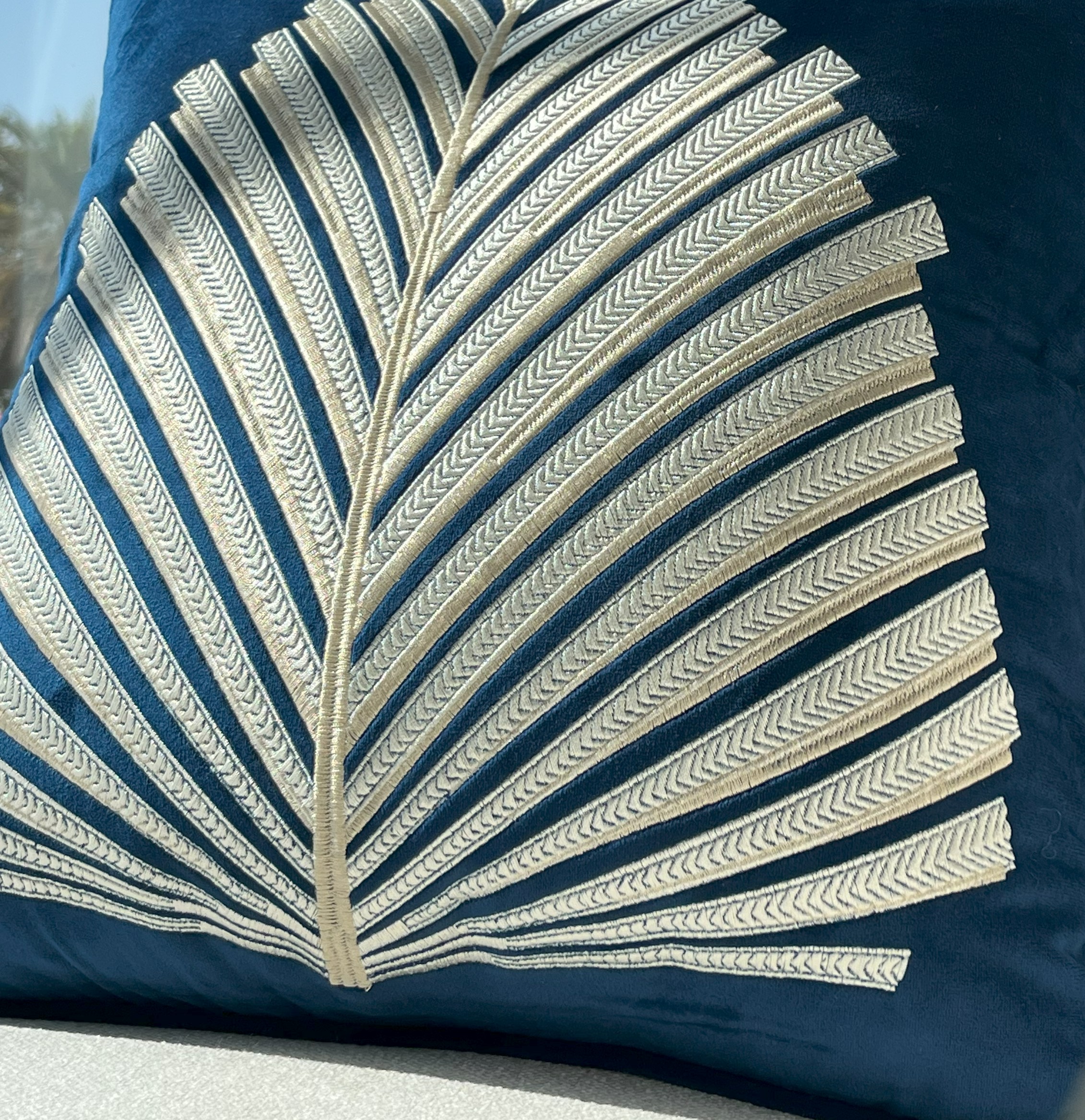 Add a touch of tropical elegance to your decor with this stunning Embroidered Blue Velvet Decorative Cushion Cover. Featuring a beautiful embroidered palm leaf design on a rich blue velvet fabric, it's sure to elevate any sofa or armchair.