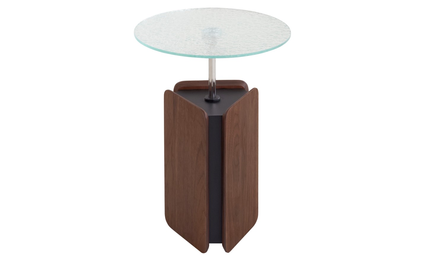 Elevate your living space with this unique side table by Fahmy Furniture. It features a substantial round textured glass top supported by a sleek silver metallic pole. The sculptural base consists of curved panels creating a distinctive, mid-century modern profile.