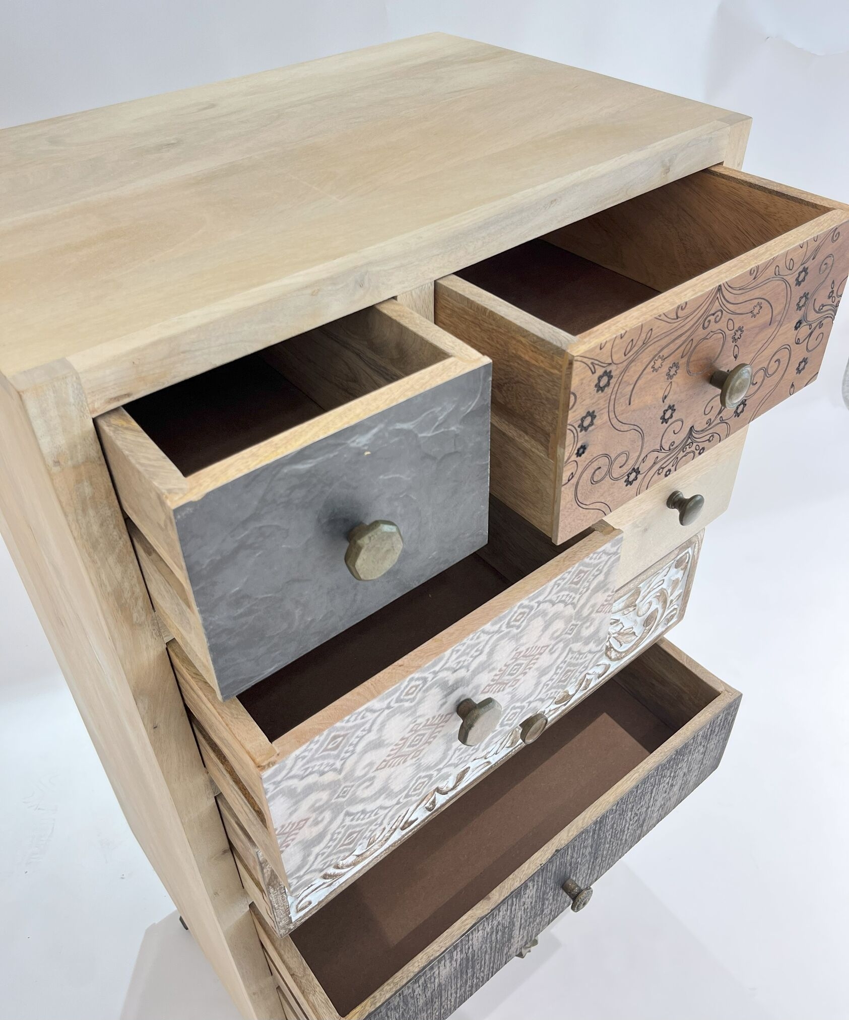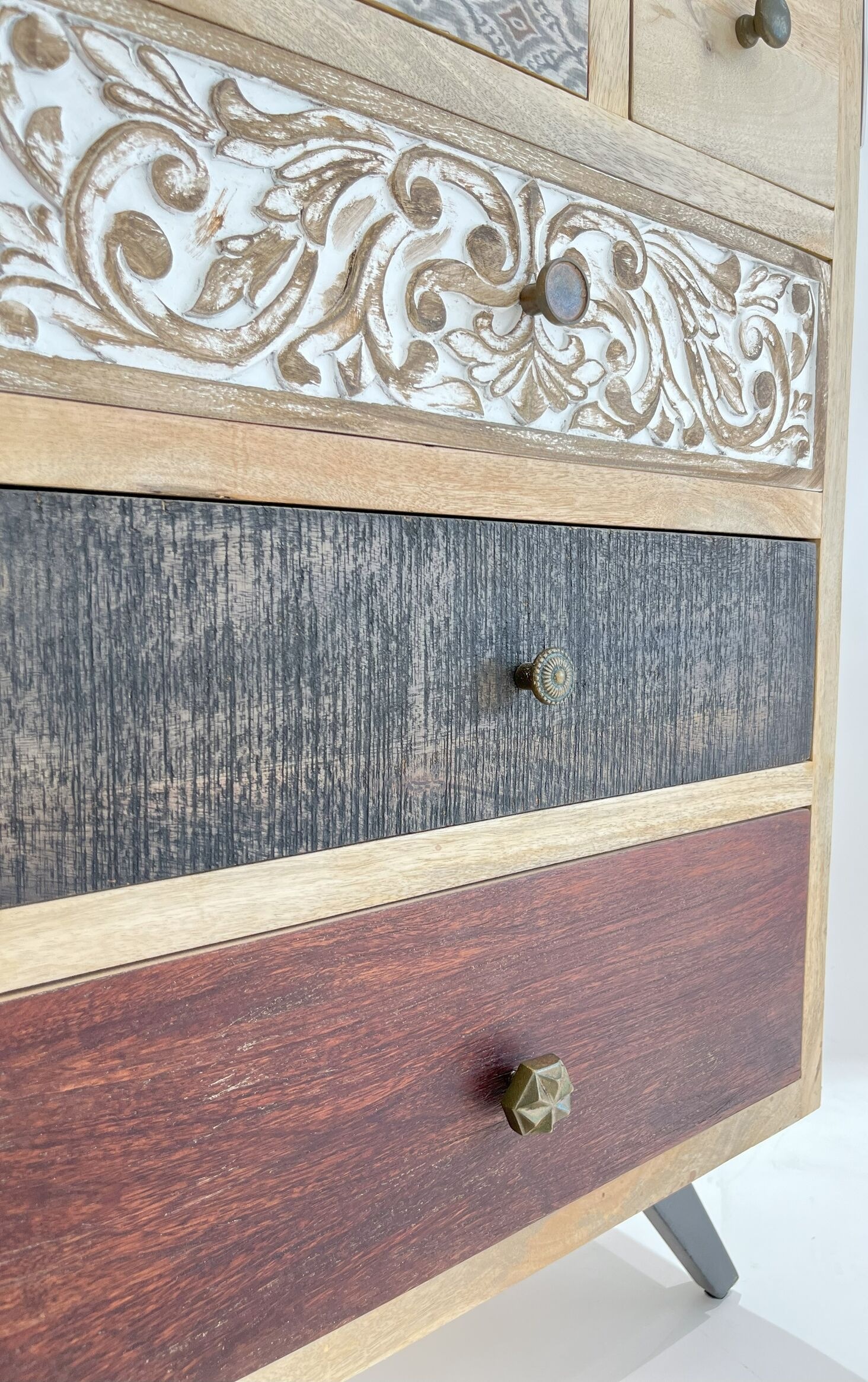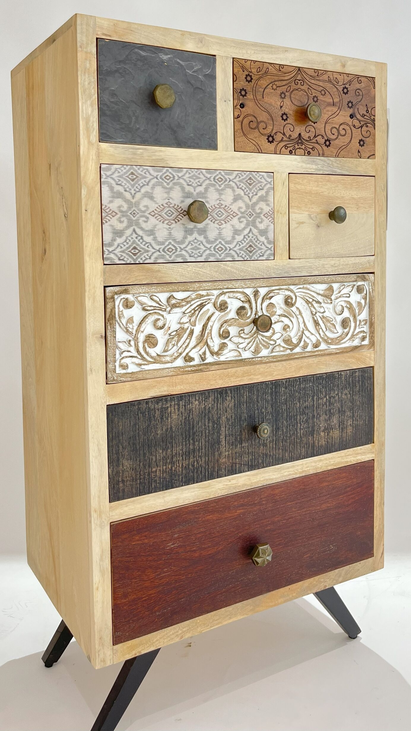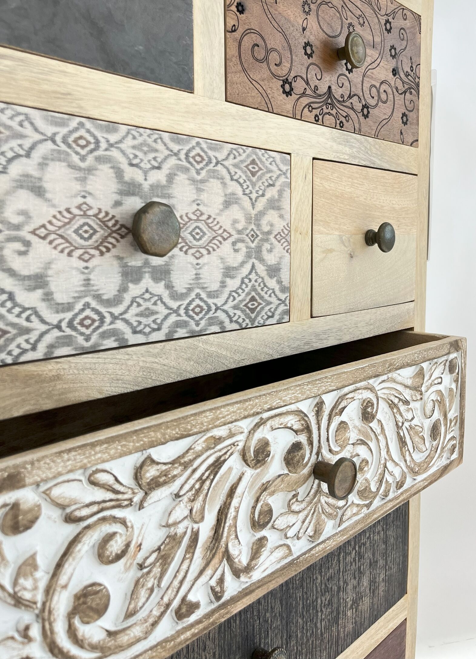 Elevate your home decor with the Handcrafted Mango Wood 7 Drawer Chest. Featuring a unique combination of patterns, textures, and carvings, this handcrafted storage unit offers functionality with artistic flair. Perfect for organizing your essentials, it brings rustic charm and versatility to any bedroom, living room, or entryway.