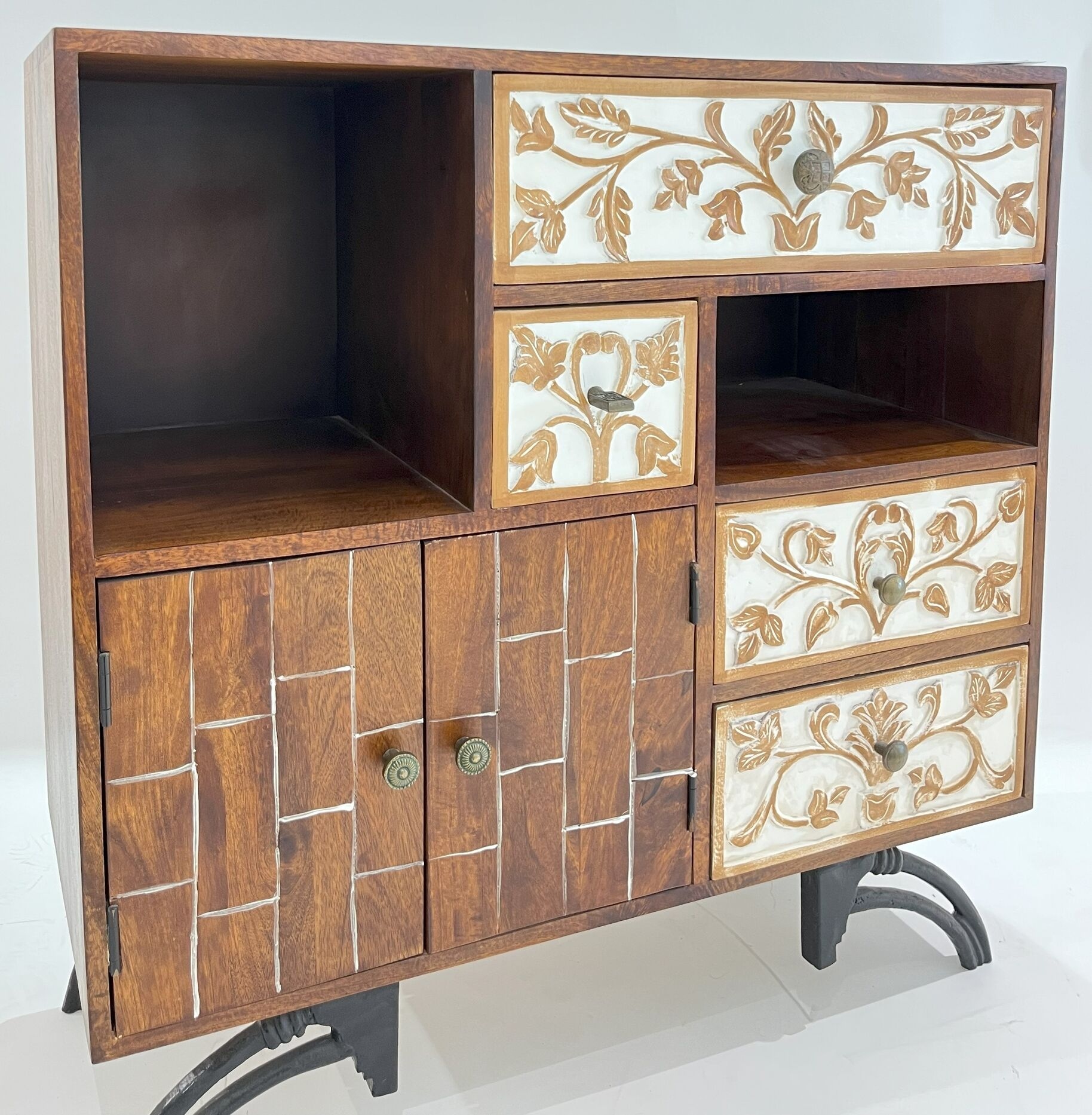 Add functional artistry to your home with the KA3636 mango wood chest of drawers. Featuring intricate carved floral detailing and natural mango wood grain, this storage unit offers ample space for organizing essentials while elevating your decor. Its rustic finish and sturdy design make it perfect for any living or bedroom setting.