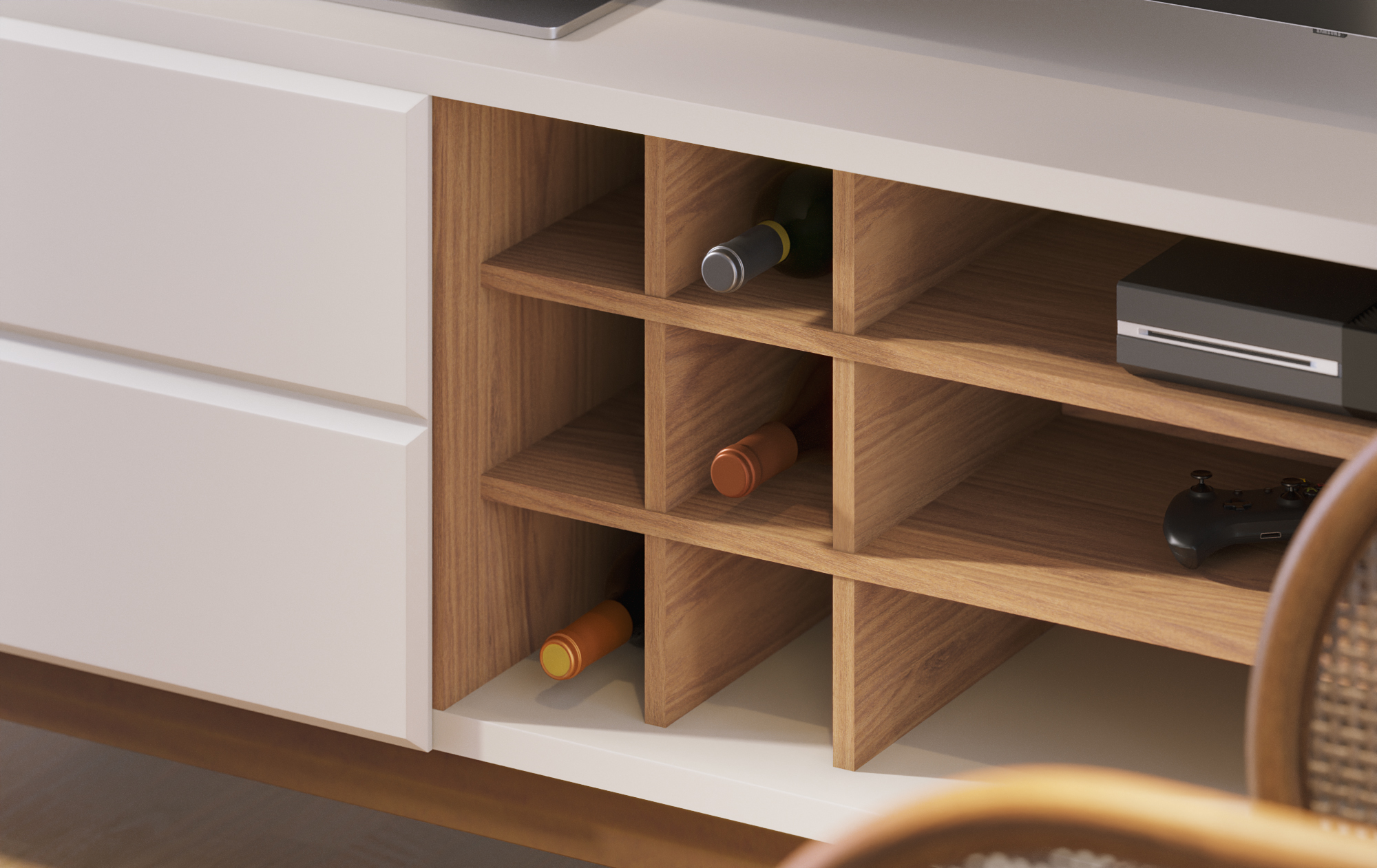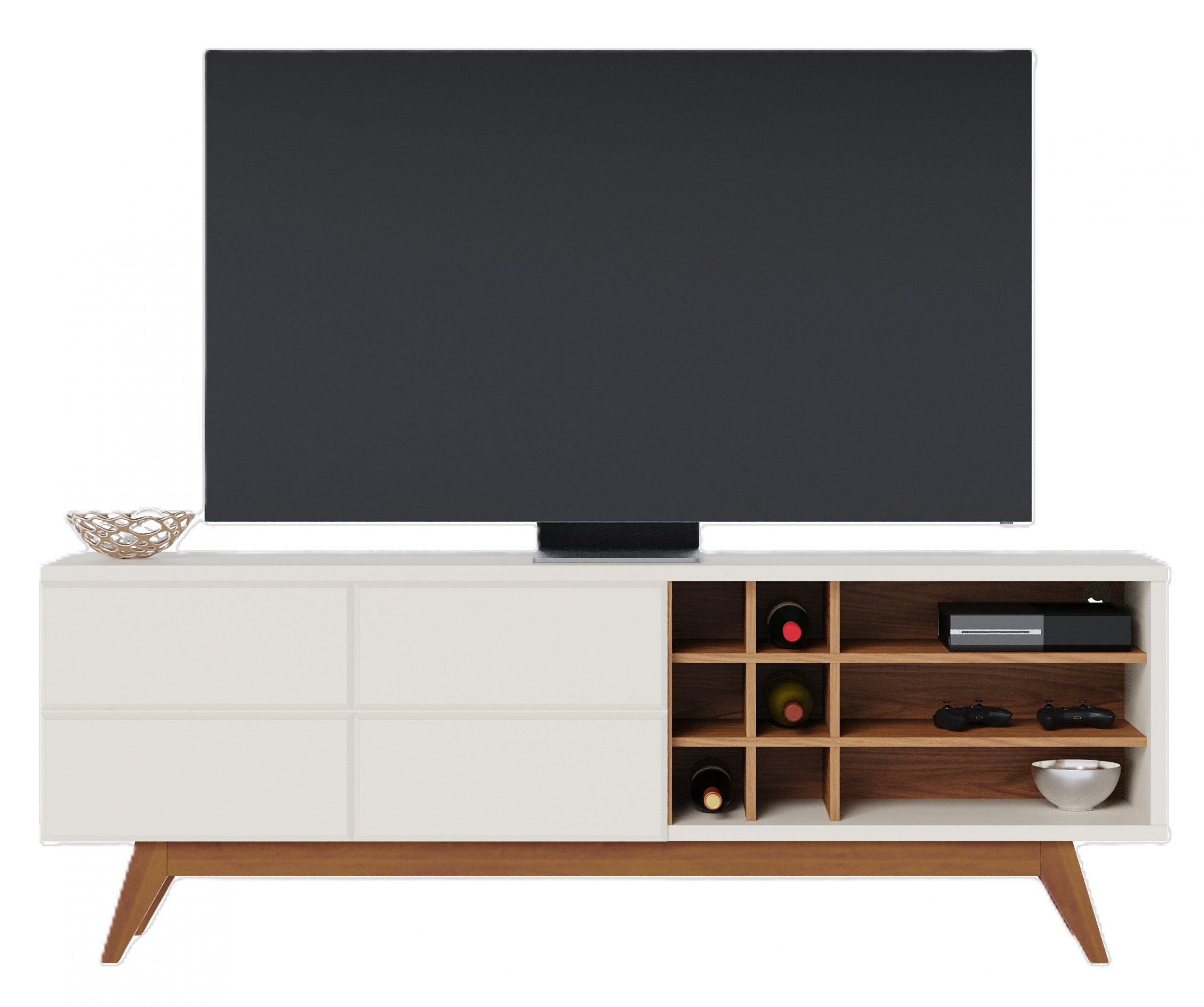 Style meets function with the Noronha TV Stand. Measuring 180cm wide, it provides ample space for your television and media devices. Featuring a clean Off White matte finish contrasted with a warm Freijo wood tone frame and accents, it offers storage behind handle-less doors and open shelving.