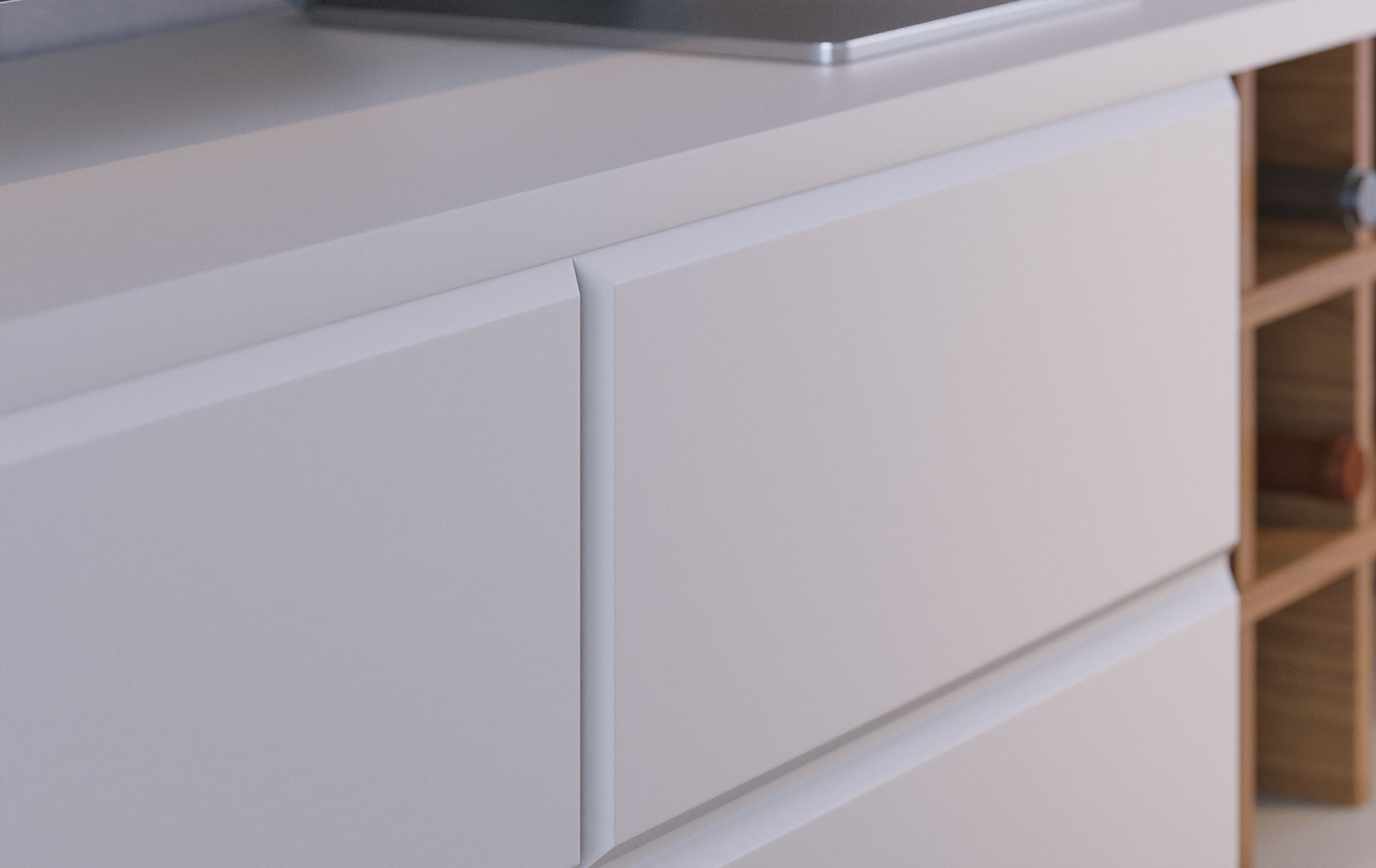 • Handle-less fronts, and unique decorative side detailing