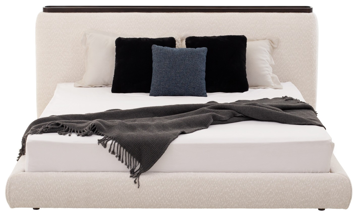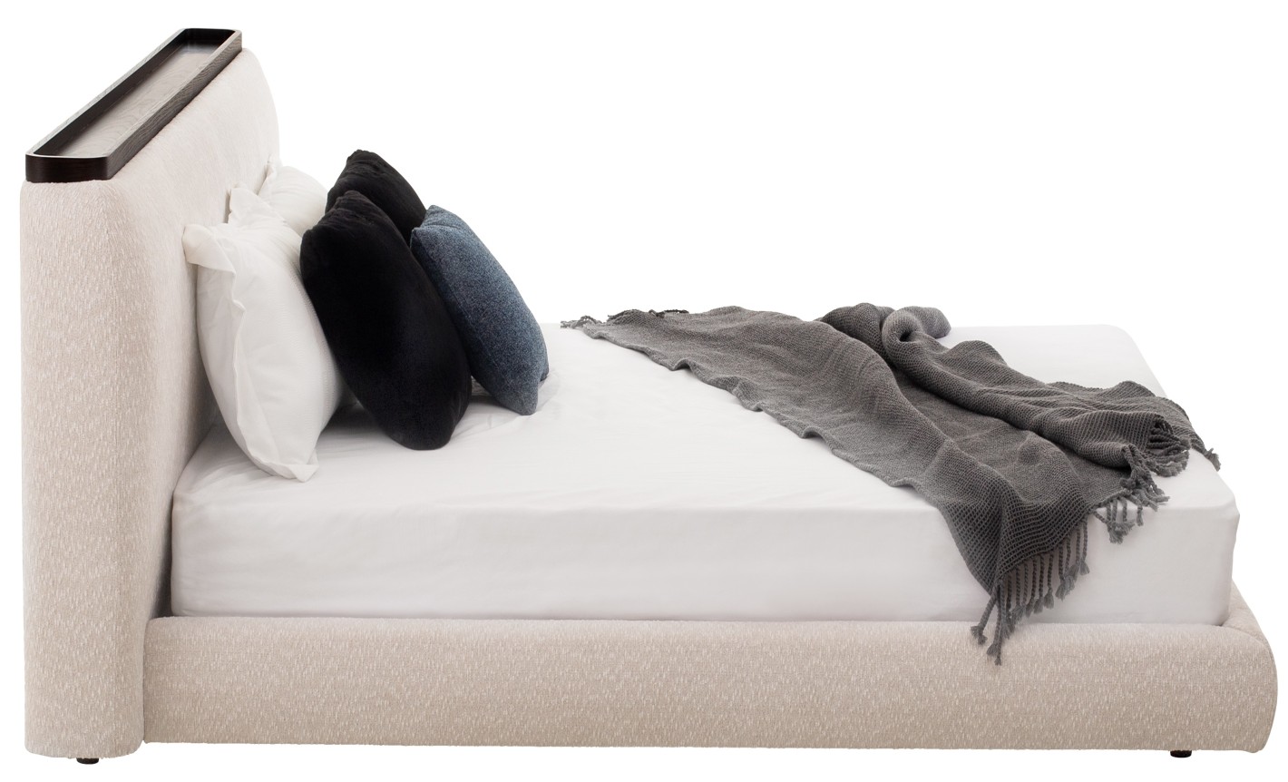 Bed frame and headboard are wrapped in a cozy, textured boucle fabric