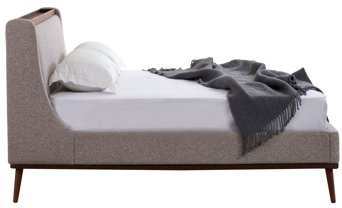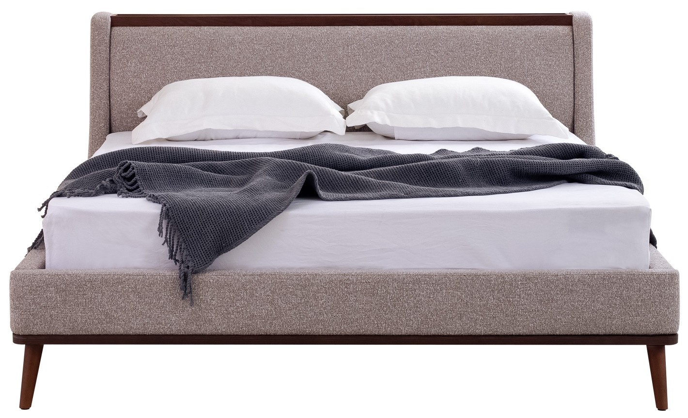 This upholstered king bed by Fahmy Furniture features a contemporary design. The frame and headboard are wrapped in a light grey textured fabric, complemented by a sophisticated dark walnut wood trim along the headboard's peak. Supported by elegant tapered solid wood legs.
