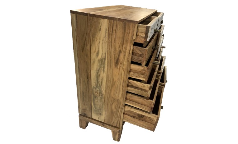 Organize your essentials with artistic flair using the Krisna 12 Drawer Accent Chest. Crafted from rich acacia wood, this unique piece features intricate white carved panels over vibrant green accents, creating a captivating leafy motif
