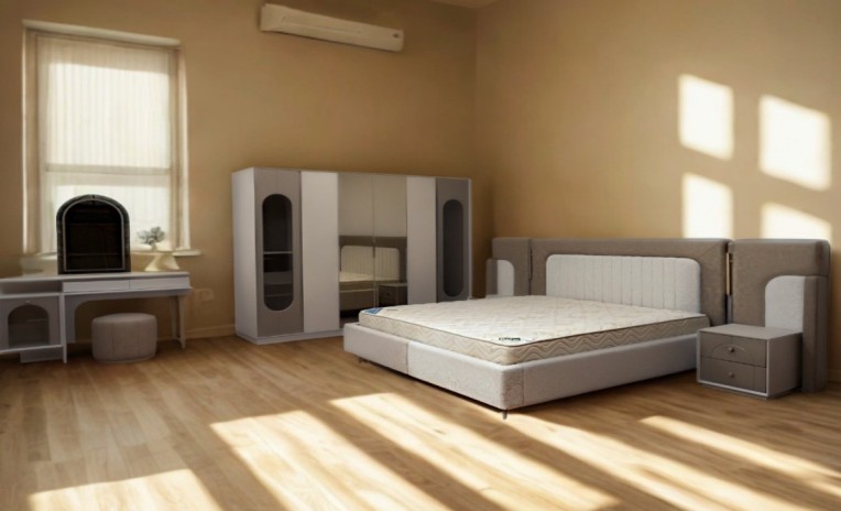 Create your dream bedroom with the Mercan King Bedroom Set. This complete set includes a stylish King size upholstered bed, two nightstands, a dresser with mirror, a spacious wardrobe, and a matching pouf. Featuring a chic design in neutral tones, it offers both elegant aesthetics and ample storage for a contemporary bedroom.