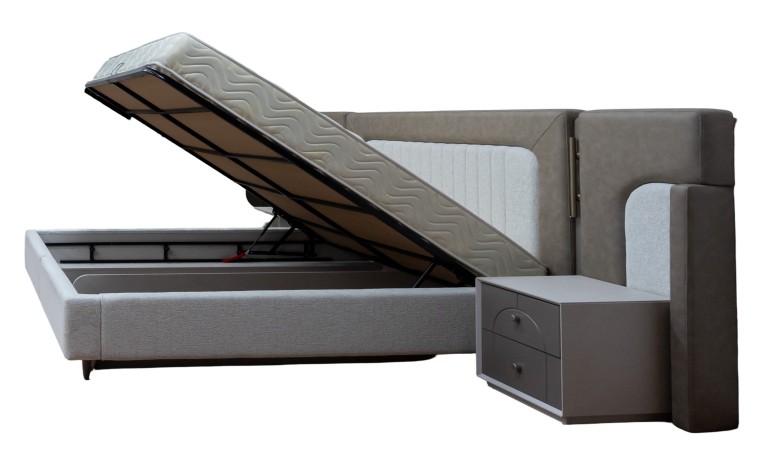 - Bed: Fabric and PVC upholstered headboard with integrated LED lighting | 220 x 320 x 130 cm