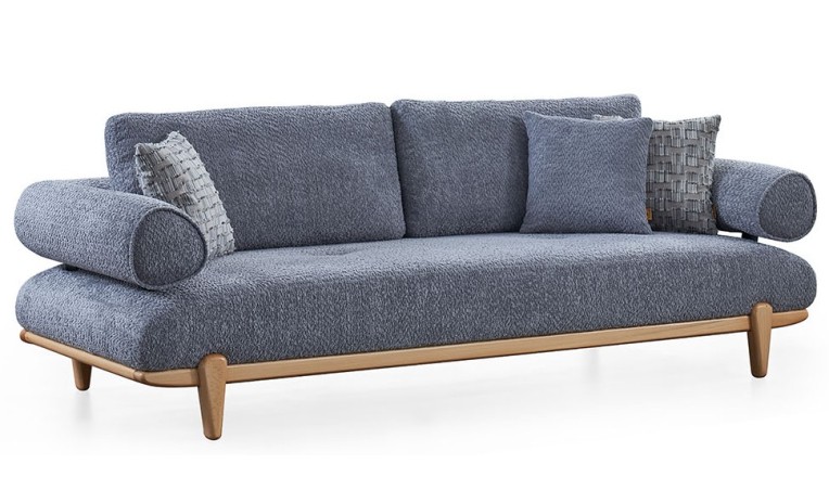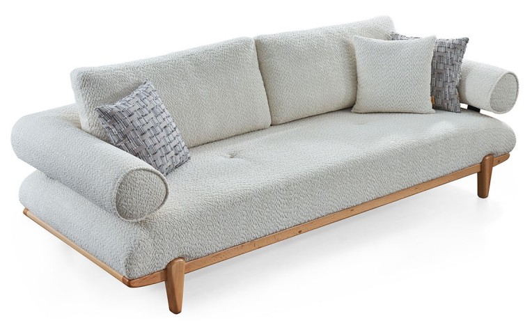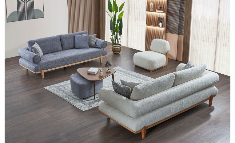 Transform your living room into a haven of comfort and style with the New Aura Living Room Set. Featuring light-toned fabric upholstery and warm wooden bases. Experience contemporary design and plush relaxation, perfect for gathering with loved ones or enjoying quiet moments.