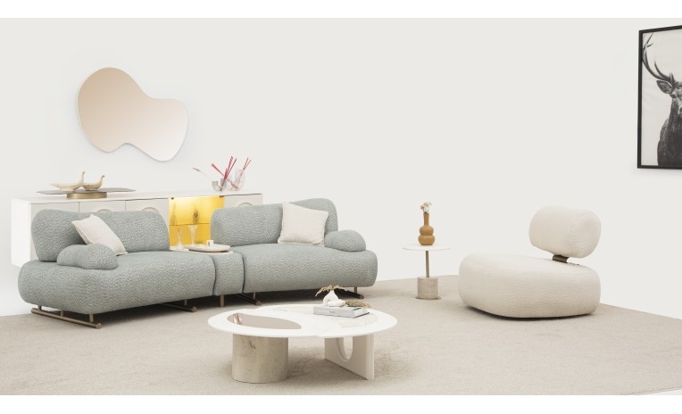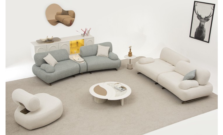 Discover the perfect blend of style and comfort with the Oslo Living Room Set. Its soft, curved silhouette and plush, boucle-like fabric create a cloud-like seating experience. The versatile design allows you to reconfigure the set to fit any living space, from a spacious living room to a cozy lounge.