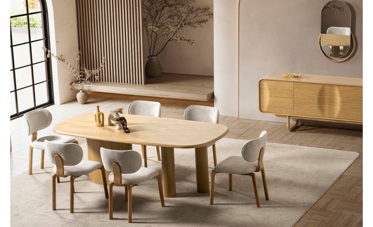 Gather in style with the Palermo Dining Room Set. This sophisticated ensemble features a spacious, light wood oval dining table supported by a unique double pedestal base, paired with eight ergonomically designed dining chairs with comfortable upholstered seats and backs.