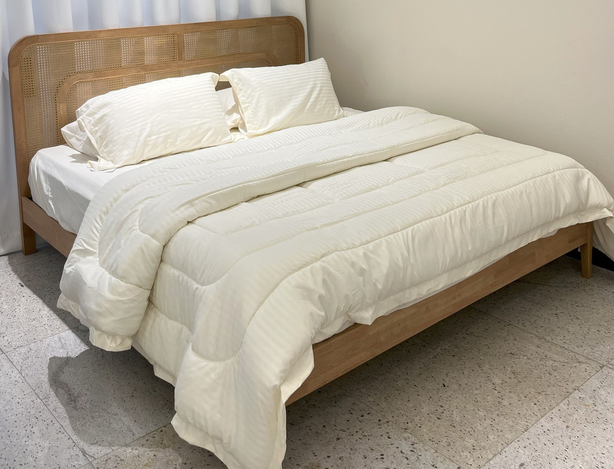 Indulge in relaxation with this stylish king size bed. Featuring a woven rattan headboard and a warm beech wood finish, it adds a touch of natural elegance to your bedroom.