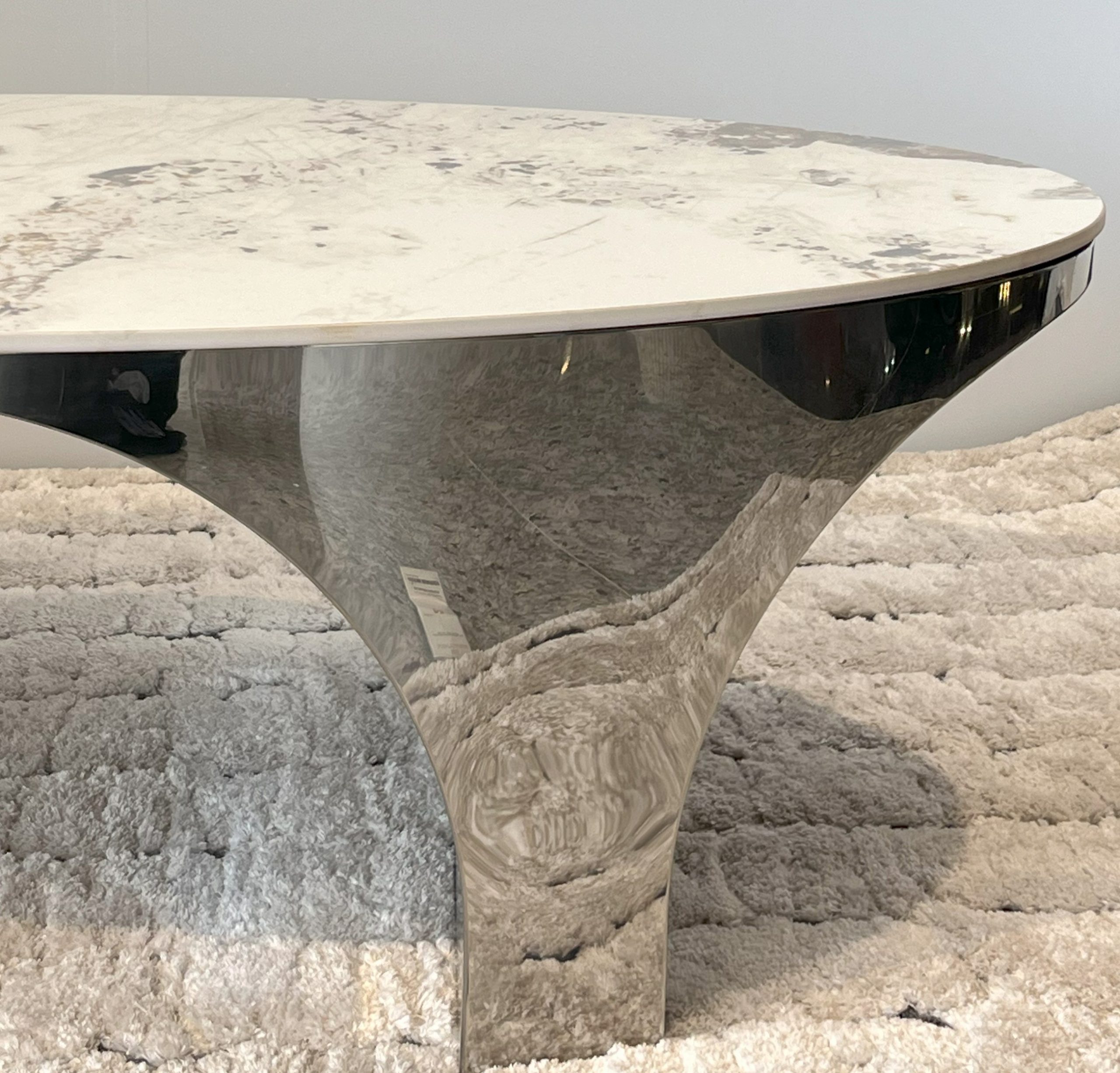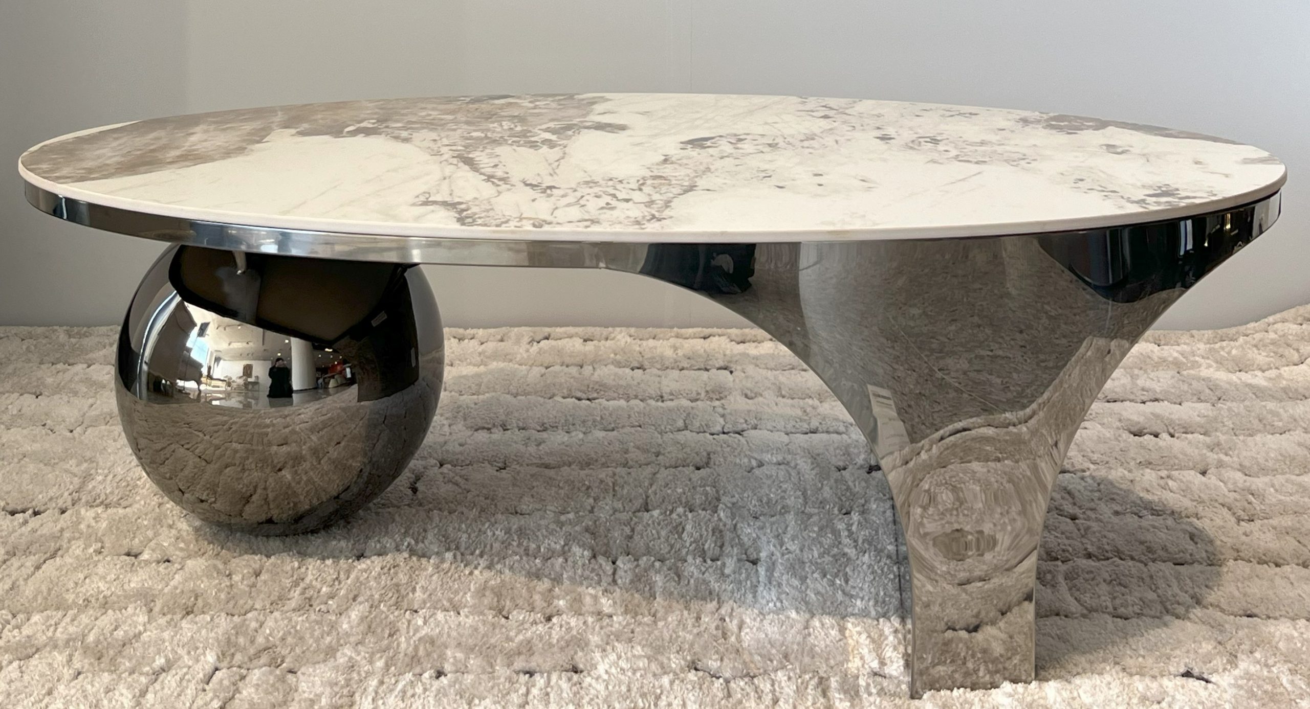This statement Center Table features a sleek oval marble top and a unique sculptural chrome base, creating a conversation-starting centerpiece for your living room.