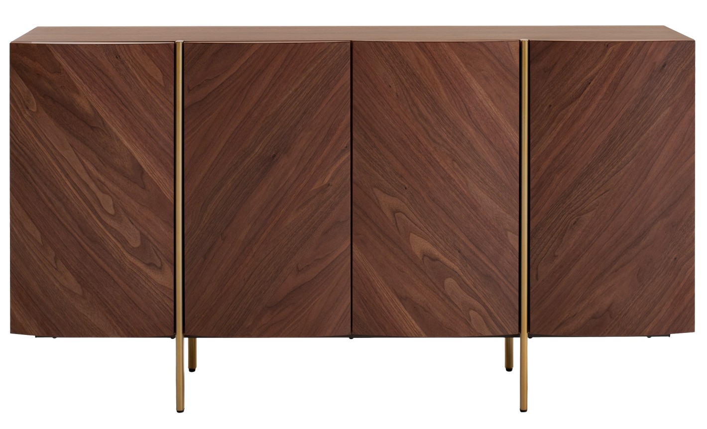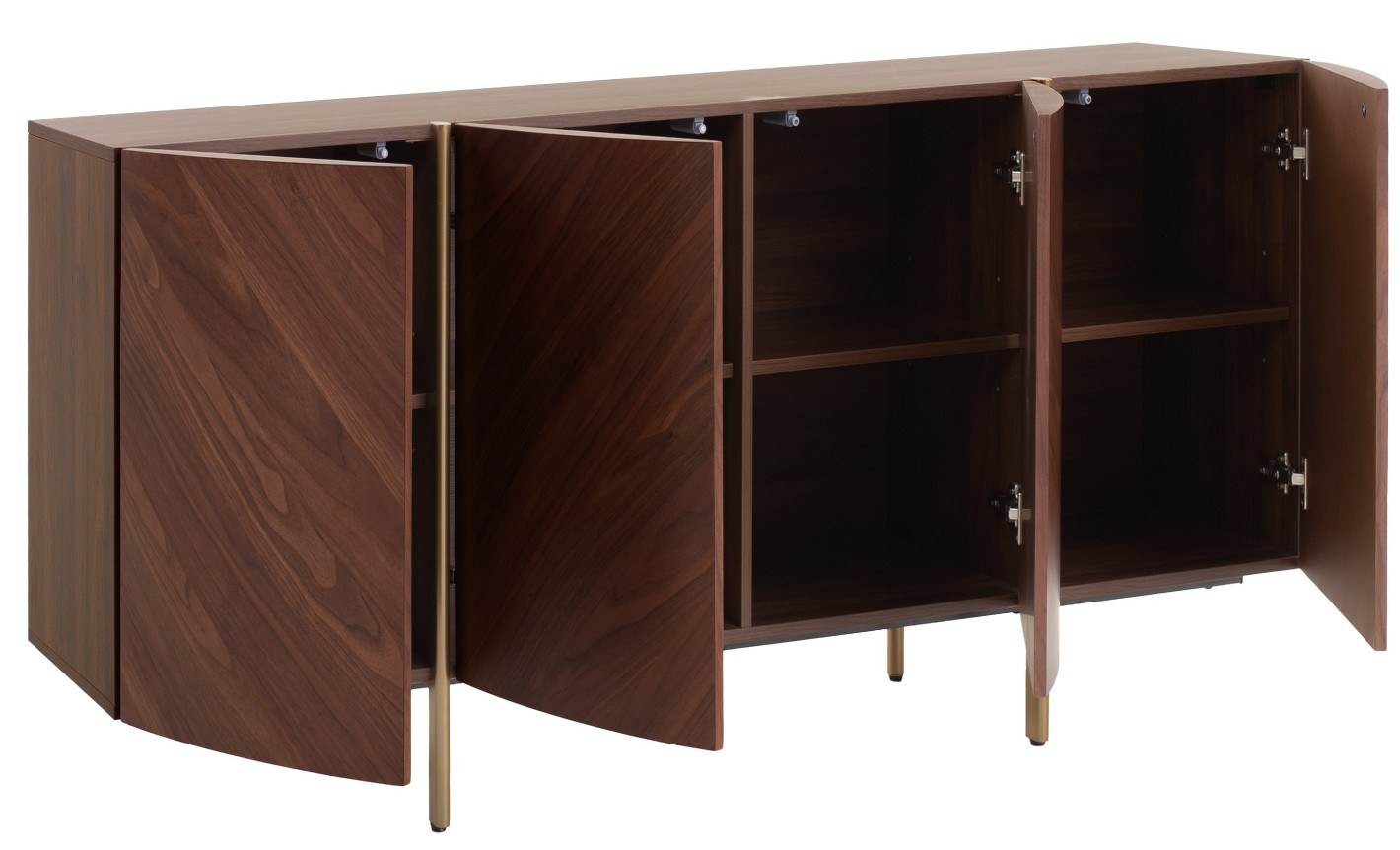 Introduce dramatic style and storage with this unique modern sideboard by Fahmy Furniture. It features a striking curved silhouette and four doors finished in a rich walnut wood grain with diagonal patterning.