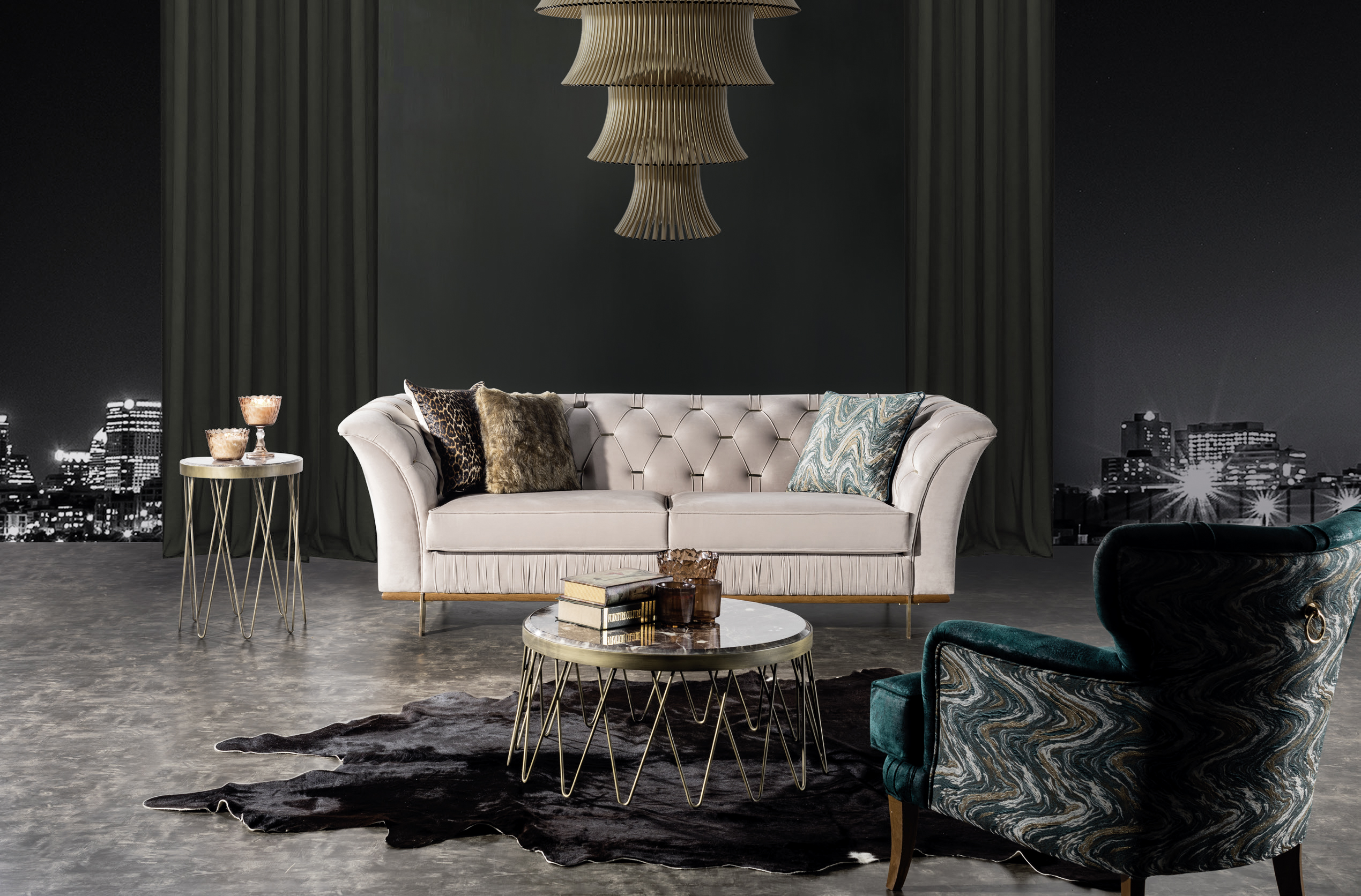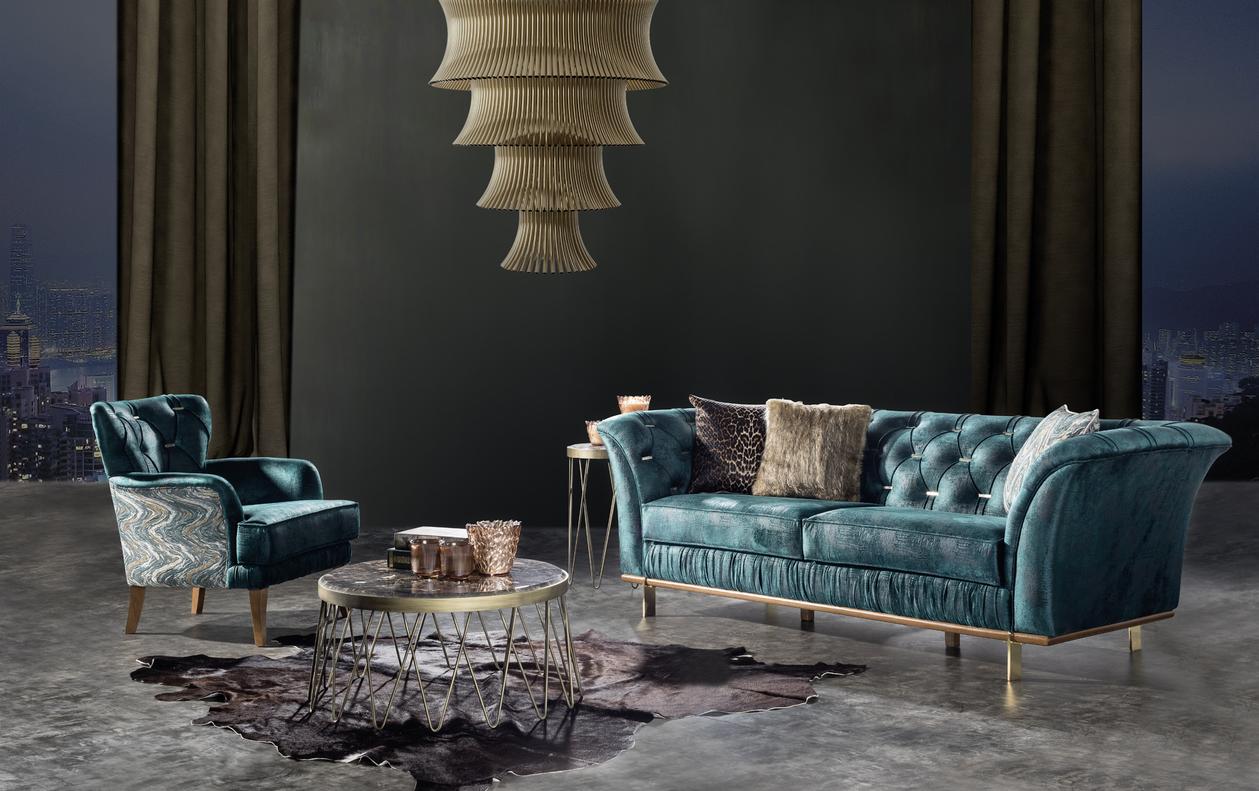 Indulge in ultimate luxury with this stunning Chesterfield sofa set. Featuring a rich teal velvet upholstery, gold accents, and classic Chesterfield detailing, it's a statement piece for any living room.